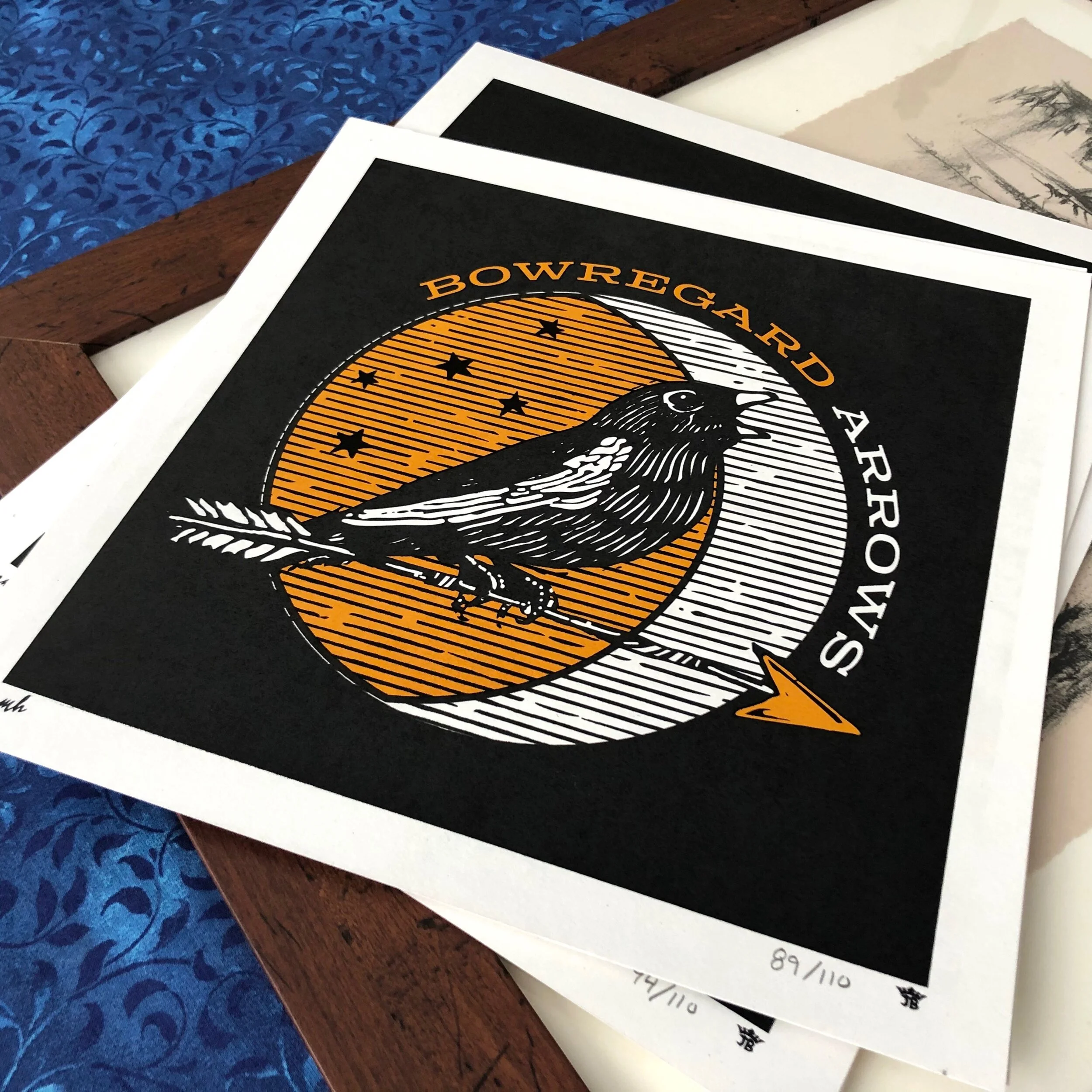 Design for bluegrass band Bowregard as part of the band’s debut album Arrows. Design was used for shirts, hand-printed posters, stickers, and the on-disc CD artwork. Illustrated with a vintage woodcut feel, the image features a lark bunting, the state bird of Colorado.