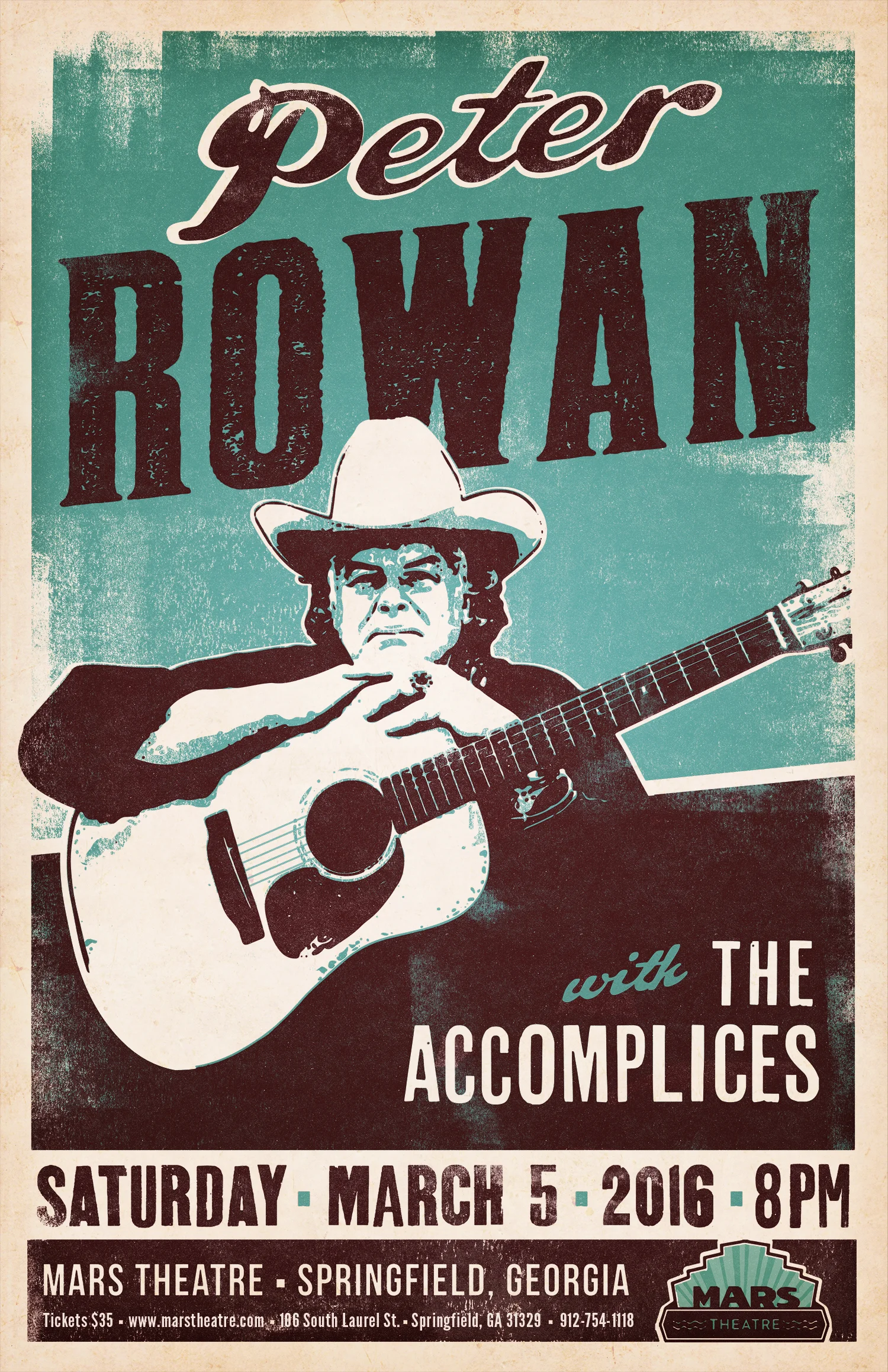 Poster for a theater concert headlined by Grammy-award winning bluegrass and folk legend, Peter Rowan.