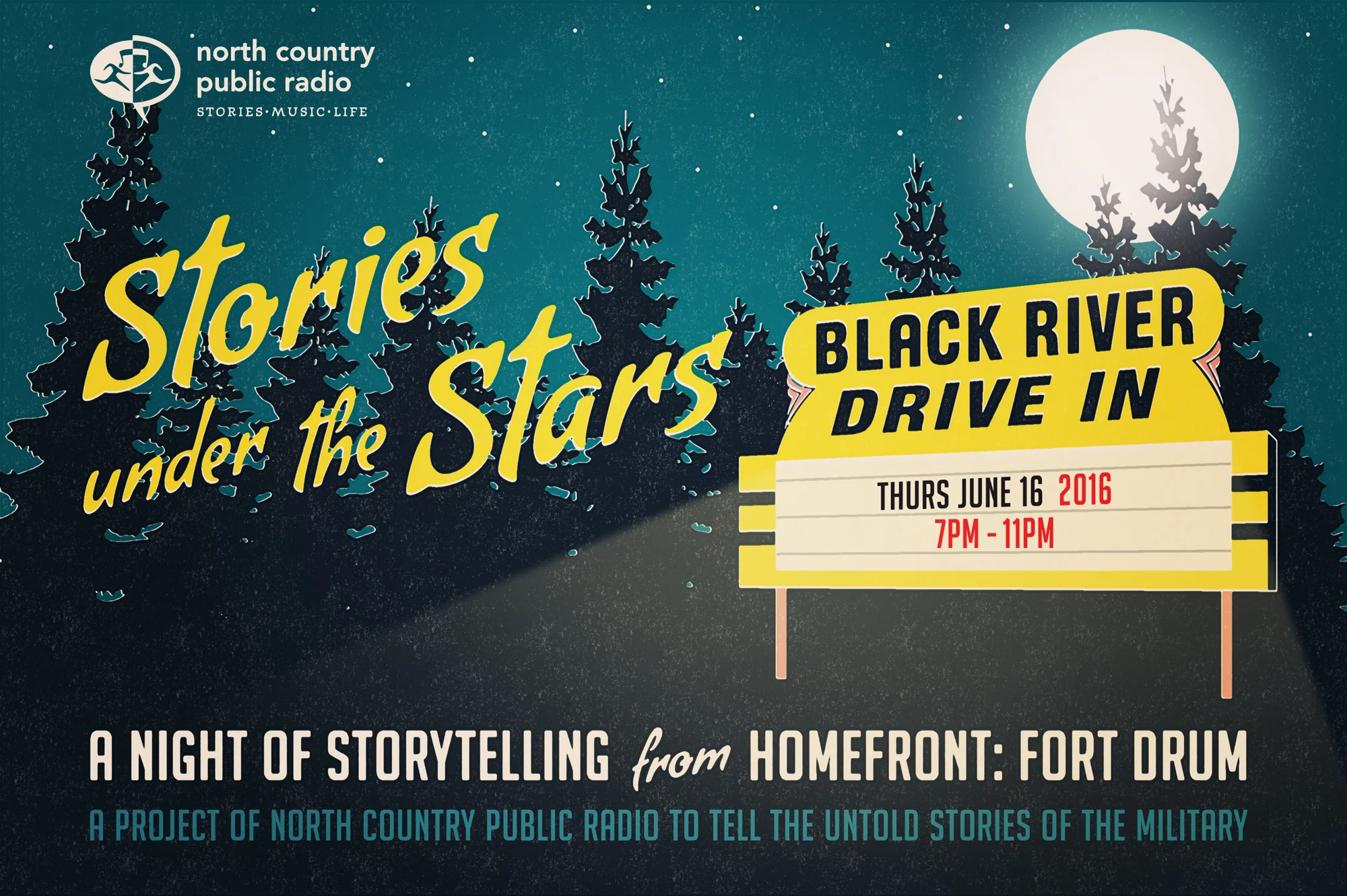 Stories Under the Stars was a public event held in Fort Drum, NY, as the culmination of a 9-month research project conducted by Meredith Turk of Localore: Finding America and North Country Public Radio. The unique venue for the event was a drive-in movie theater, with a retro marquee like the one depicted in the image.